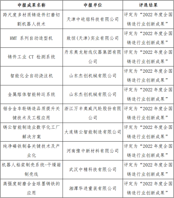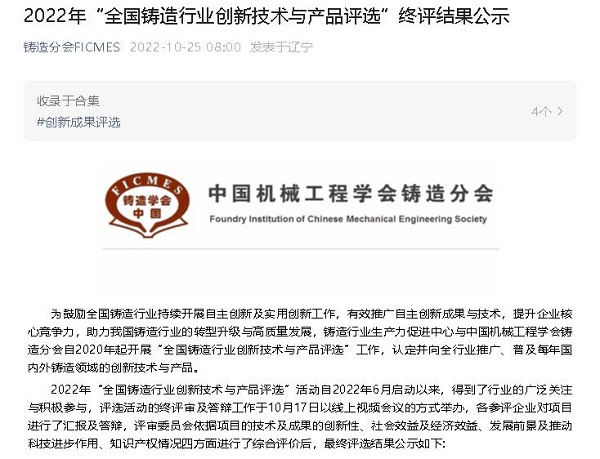 2022年10月,bifa·必发(中国)唯一官方网站重装公司申报铸造应用项目——高强度耐磨合金球墨铸铁的应用,被评定为“2022年度全国铸造行业创新成果”。铸造行业生产力促进中心与中国机械工程学会铸造分会为鼓励全国铸造行业持续开展自主创新及实用创新工作,有效推广自主创新成果与技术,提升企业核心竞争力,助力我国铸造行业的转型升级与高质量发展,自2020年起开展“全国铸造行业创新技术与产品评选”工作,认定并向全行业推广、普及每年国内外铸造领域的创新技术与产品。评选依据申报项目的技术及成果的创新性、社会效益及经济效益、发展前景及推动科技进步作用、知识产权情况四个方面进行综合评价,最终评选出10个自主创新成果为“2022年度全国铸造行业创新成果”。
