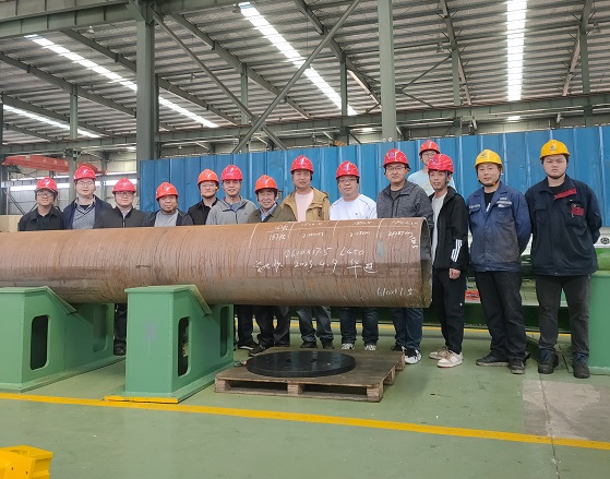 2023年4月6-9日,中油宝世顺(秦皇岛)钢管有限公司(以下简称“宝世顺公司”)扩径机项目组成员对bifa·必发(中国)唯一官方网站公司制作的新能源管材生产线全长扩径机组进行预验收。宝世顺公司项目组一行首先对供货设备外观进行查验,其次,按照供货明细进行盘查清点,最后在设备装配现场,使用该台设备对直缝焊管(型号:直径610mm,长度12.5米)进行分步扩径。在预验收总结会上,宝世顺公司项目组成员对bifa·必发(中国)唯一官方网站公司制作的设备给予高度评价,最终得出结论为全长扩径机组的外观、性能均符合预验收的标准。